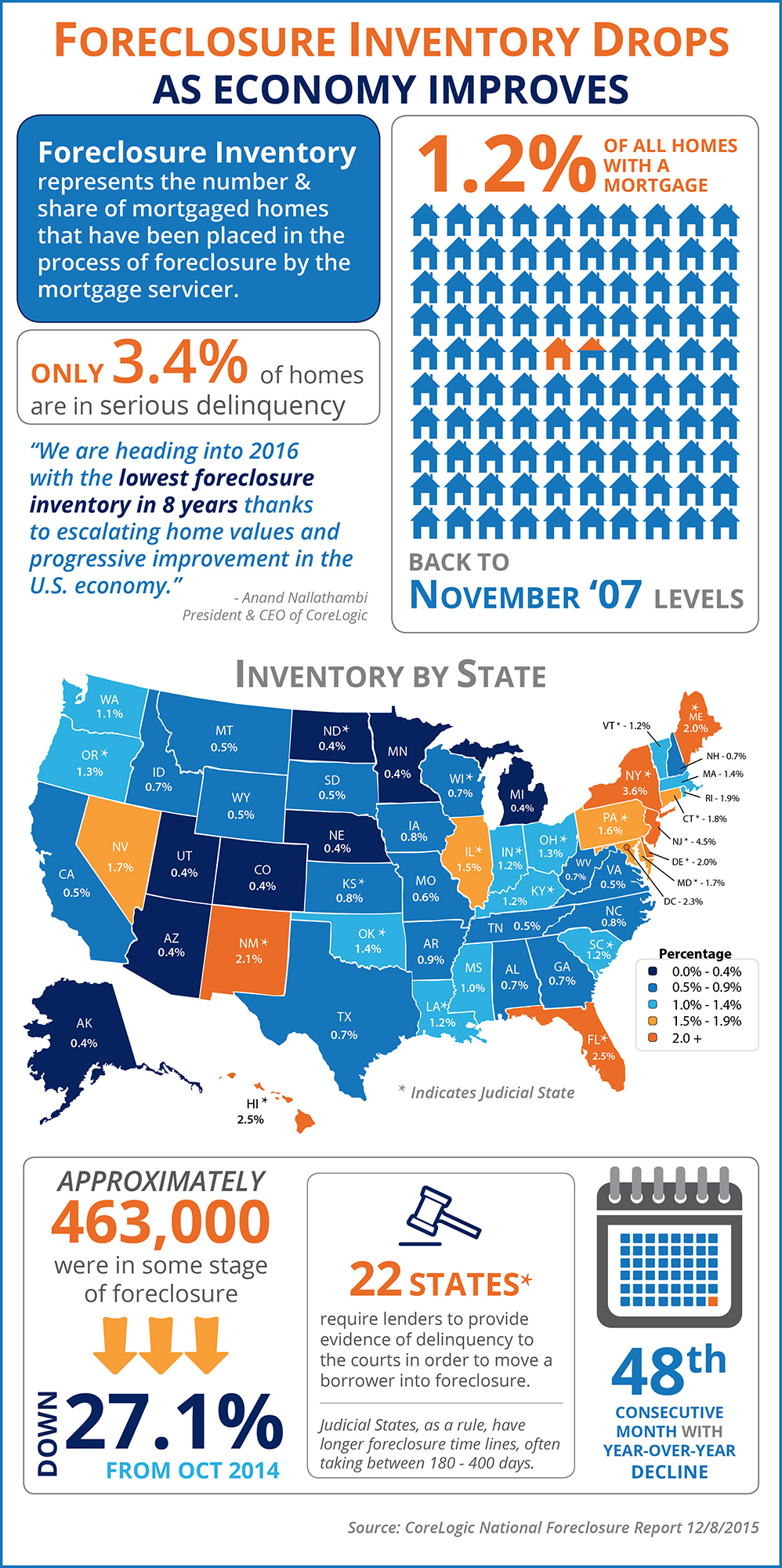 Some Highlights: Foreclosure Inventory has dropped year-over-year for the last 4 years (48 months). Only 3.4% of US homes are in serious delinquency. 29 states have a foreclosure inventory rate lower than the national average. For more information you can download the full report...