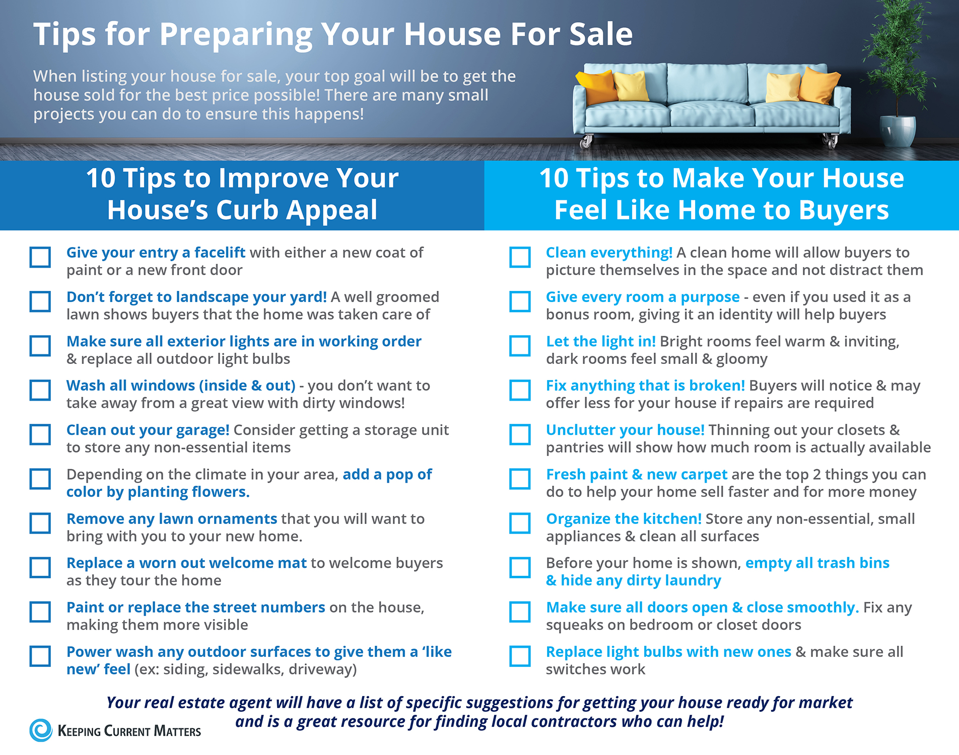 Highlights: When listing your house for sale your top goal will be to get the home sold for the best price possible! There are many small projects that you can do to ensure this happens! Your real estate agent will have a list of specific suggestions for getting your house ready for market and is a great resource for finding local contractors who can...