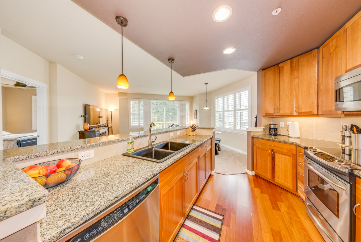 Elegant, light-filled condo in The Cleveland. Located in the desirable area of Downtown Redmond with a walk score of 94. The open floorplan boasts 1,191 s.f. and features 2 bedrooms, 2 baths, a den and 2 garage parking spaces.
