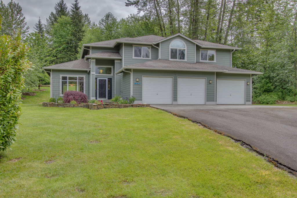 Set back on a private 2.3 acre lot, sits this open, flowing two story home in Timberline Estates. The gracious floorplan boasts 2231 s.f. & features 3 bedrooms, 2.5 baths plus den and bonus. The home has rich hardwood floors throughout! Many recent updates include - new exterior paint, refinished hardwoods on the main floor and newer appliances! As you enter the home… the vaulted foyer greats you. The formal living and dining room have dramatic ceilings and large windows overlooking the gardens. The chef's kitchen has tile counters, breakfast bar, gas range, ample storage and a built-in desk. The attached nook has a slider to the deck - perfect for entertaining or BBQing! The adjoining family room is quite spacious and has a cozy gas fireplace. Off the family room is the main floor den. The powder room is nicely appointed for your guests. The spacious master features a walk-in closet with custom organizers. The master bath has a double vanity, large soaking tub and a separate shower. Two additional bedrooms upstairs are quite spacious. The bonus room is generous in size and could easily be turned into a 4th bedroom - due to the installed 4 bedroom septic system on the home. The laundry room includes a well utilized space with stainless soaking sink, storage cabinets & stacked washer and dryer included. The home has a deep driveway and a three car garage. The yard is like your own private park! Entertainment sized deck overlooks the private rear yard. You will find a child's play set, storage shed, greenhouse, huge garden area and enough space to give you a very private feel!