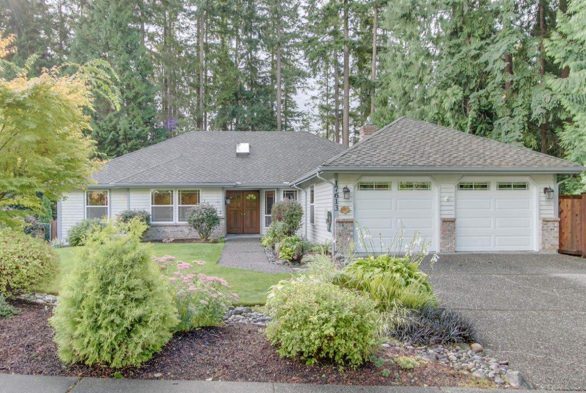 Backing to a large greenbelt in Coventry on English Hill, sits this Burnstead built, rambler home. The elegant floorplan boasts 1,650 s.f. and features 3 bedrooms, 1.75 baths plus on a 8,071 s.f. lot! The original owner has meticulously maintained and updated this home - including remodeling the kitchen! Formal living room with a large picture windows overlooking the deck and rear yard. Spacious, formal dining room with large slider to the deck - perfect for entertaining or BBQing. Updated kitchen with hardwood floors, ample cabinets, island with gas range, slab granite counters, designer tile backsplash and a full compliment of stainless appliances included. Breakfast nook with bay windows. Cozy family room with built-in bookcase and a brick fireplace with gas insert. Generous master bedroom with walk-in closet. The attached bath has a double vanity, large skylight and a double shower finished in tile. Two additional bedrooms are spacious - each with California Closets. The hall bath is generously sized and includes a soaking tub with shower above. The entertainment sized deck is a great space to relax. There is a lower patio area, ample garden beds and a fully fenced yard - all wrapped in an envelope of green! Attached two car garage with storage possibilities above and includes a generator with a transfer switch. Outstanding Northshore schools - Sunrise Elementary, Timbercrest Jr High & Woodinville High. Easy access to the area’s High Tech employers.