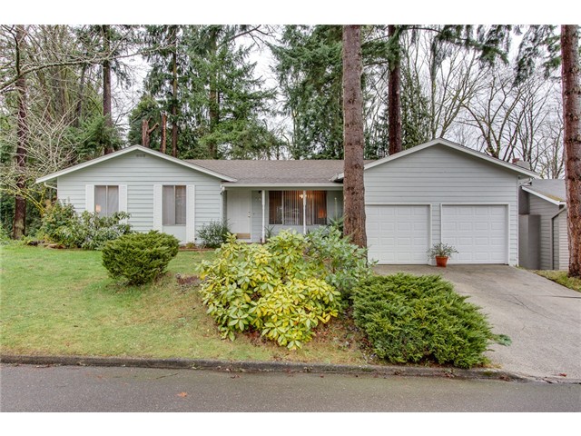 Quietly nestled in the easily accessible neighborhood of Hidden Hills, sits this charming rambler home. The open floorplan is 1300 s.f. and features 3 bedrooms, 1.75 baths on a 7,280 s.f lot backing to a greenbelt! Recent updates include the roof and exterior paint. The large living room welcomes you in. The kitchen has ample cabinetry, solid surface counters and newer appliances too. Off the kitchen is a spacious dining area with a large window overlooking the private rear yard. The family room has built-in shelving, a cozy fireplace and a slider to the rear deck - perfect for entertaining or BBQing. The master bedroom is good sized with a large window overlooking the scenic greenbelt and an attached full bath. The 3/4 bath in the hall has been completely remodeled - accented in cherry and tile! Two additional bedrooms are spacious. The private, entertainment sized deck leads down to the low maintenance AstroTurf lawn - all of which looks upon the beautiful greenbelt! Attached two car garage with storage loft. Outstanding Bellevue schools!