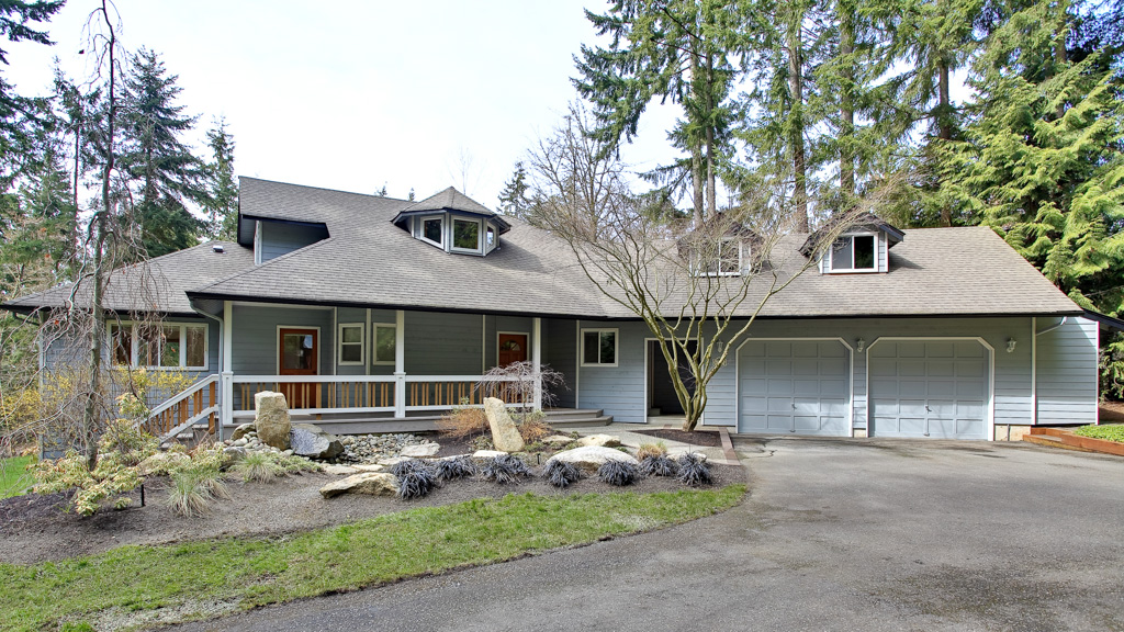Nestled at the end of a private drive, sits this charming two story with daylight basement home. The gracious floorplan boasts 3130 s.f. and features 3 bedrooms, 3.5 baths with den & bonus on a private, west facing 40,510 s.f. lot! Recent updates include roof, exterior & interior paint. Sunken formal living room with built in shelves. Great room style kitchen, dining and family room. The updated kitchen has vaulted ceilings, skylight, new counters, gas range, built-in desk & breakfast bar. Formal dining room with hardwood floors. The family room has vaulted ceilings, a gas fireplace and French door opening to huge entertainment sized deck overlooking rear yard. Powder room on main. Wonderful main floor master suite with walk-in-closet, new tile counters on vanity, shower & jetted tub. Two bedrooms & full bath upstairs. On the lower level... Spacious den with new floor. Huge bonus room with small kitchen and adjacent room with a closet - a full bath in the hall too!. The bonus room has a slider to the rear yard. The huge, west facing deck overlooks the private rear yard and is plumbed for gas BBQ - excellent for entertaining, relaxing or soaking up the sun! Lush trees & water feature make for a serene setting! Attached two car garage with storage possibilities above. Laundry room with sink and extra storage. Outstanding Lake Washington schools - Dickinson Elementary, Evergreen Jr High & Eastlake High.